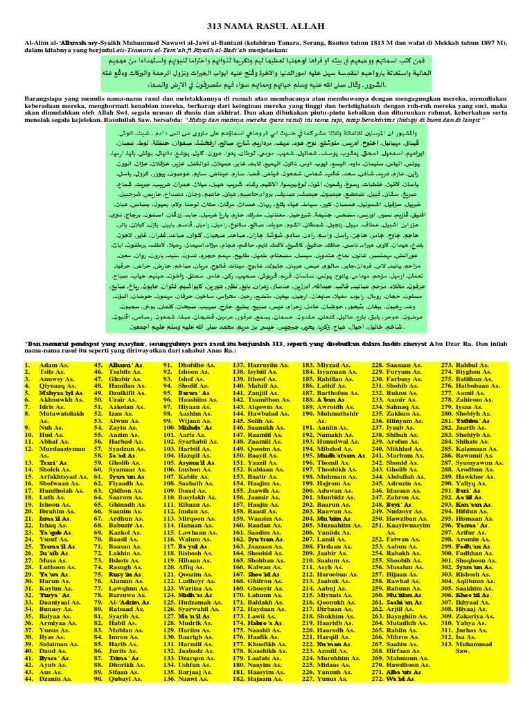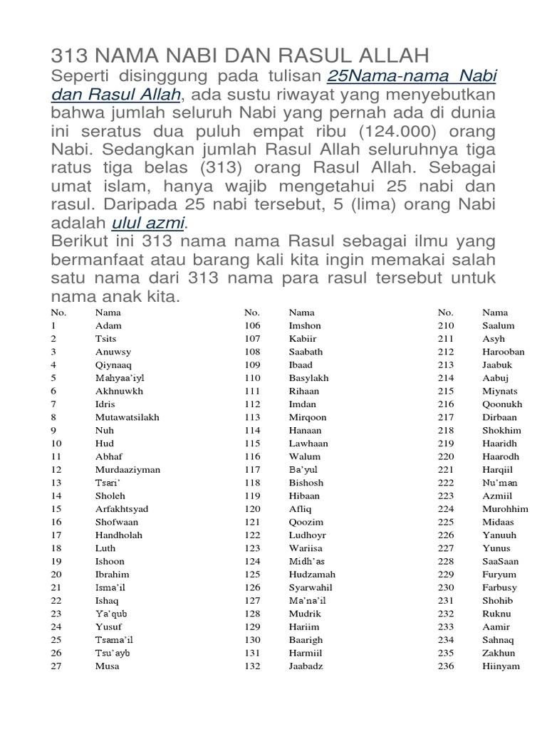 Ada yang meyakini 124 000 nabi dan 313 rasul. Sebagai tambahan ilmu yang bermanfa at atau barang kali kita dapat menggunakan salah satu nama dari para rasul tersebut untuk anak kita. Dikatakan nabi karena ia merupakan seseorang yang telah diberi wahyu oleh allah swt dan tidak diperintahkan untuk menyampaikan wahyu atau. Nama 313 rasul dan 25 nabi melengkapi keyakinan dan iman kepada rasul allah bahwa jumlah nabi dan rasul yang diketahui umat islam ada perbedaan satu kalangan hanya meyakini 25 nabi dan rasul satu kalangan meyakini ada 124 000 nabi dan 313 rasul.