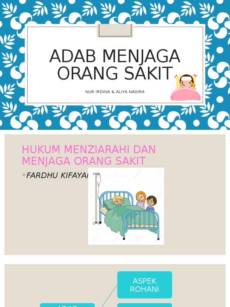 Adab menjaga orang sakit dari aspek rohani. Menjaga orang sakit dapat menguatkan hubungan silaturrahim dan sifat tolongmenolong dalam masyarakat sebagaimana yang dituntut oleh allah s w t dalam surah annisa 4. 4m s br 6. Hukum menziarahi dan menjaga orang sakit farhdu kifayah 2. Menasihati pesakit supaya bersabar dan tabah menghadapi ujian allah.