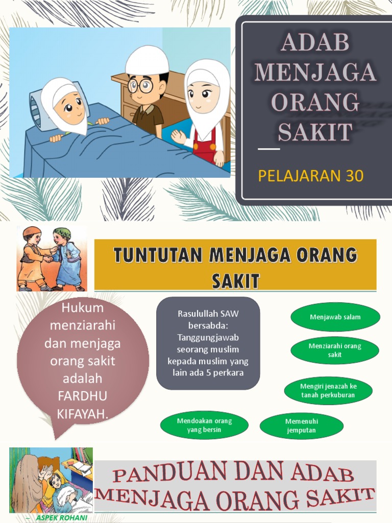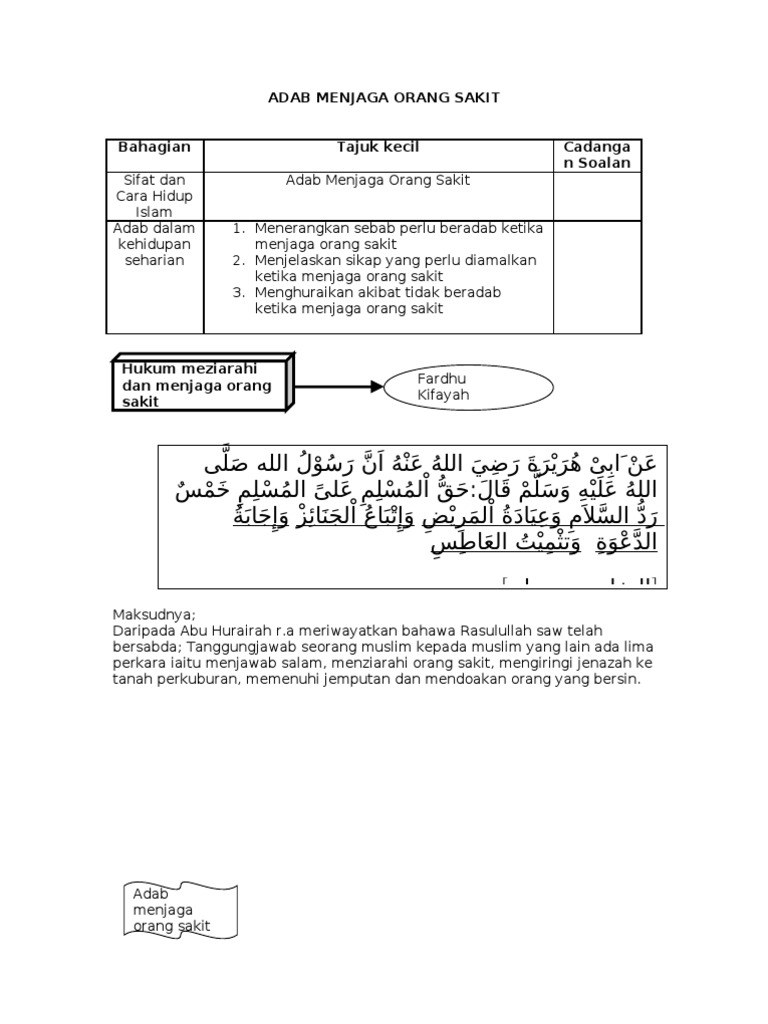 3 hukum menziarahi orang sakit ialah 4 adap menjaga orang sakit aspek rohani a b 5 melayan pesakit dengan mesra dan menunjukkan muka yang manis dapat meringankan pesakit. Panduan adab menjaga orang sakit aspek rohani memberi peringatan bahawa sakit adalah sebahagian daripada ujian allah menasihati pesakit supaya bersabar dan tabah menghadapi ujian allah mengingatkan pesakit supaya menunaikan solat lima waktu aspek emosi. Tanggungjawab seorang muslim kepada muslim yang lain ada lima perkara iaitu menjawab salam menziarahi orang sakit mengiringi jenazah ke tanah perkuburan memenuhi jemputan dan mendoakan orang yang bersin br 4. Panduan adab menjaga orang sakit aspek rohani memberi peringatan bahawa sakit adalah sebahagian daripada ujian allah menasihati pesakit supaya bersabar dan tabah menghadapi ujian allah.