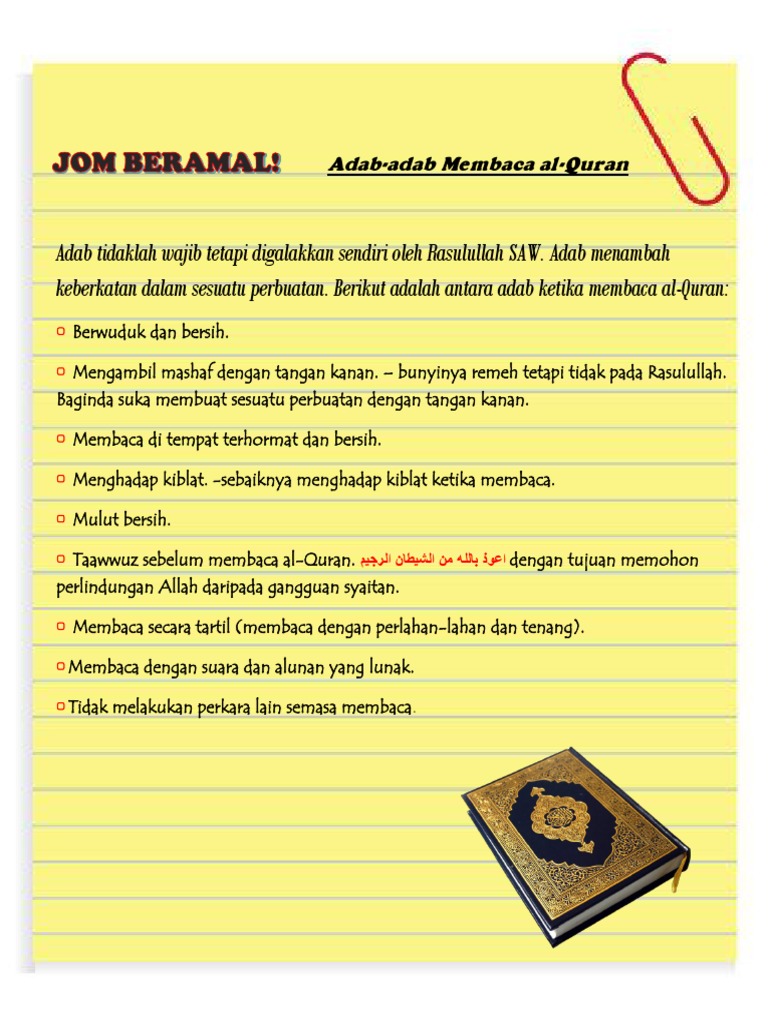 Sebelum membaca al quran ketahui dulu adab adab ketika membaca al quran. Membaca dengan pelan tartil atau tidak cepat cepat agar dapat menghayati ayat yang dibaca. Al quran bukanlah buku biasa ia adalah wahyu suci yang turun dari allah. Al quran adalah kitab suci yang diturunkan kepada nabi muhammad saw.