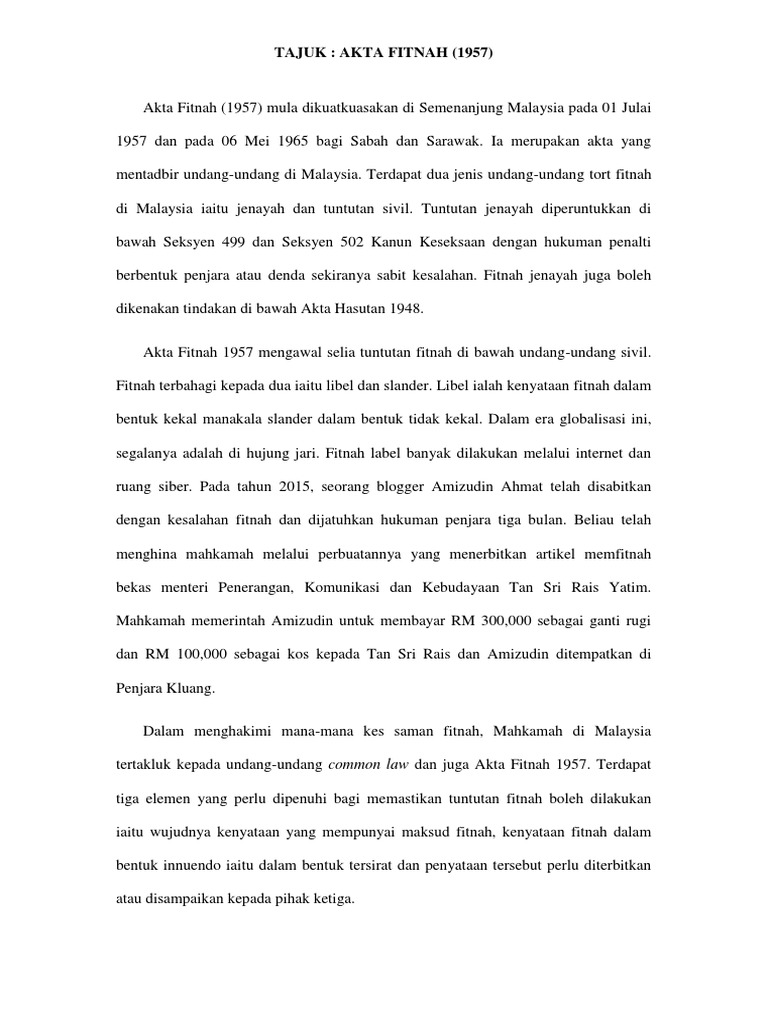 P eninsular m alaysiañ 1 july 1957. Download pdf ebook here. This can be especially useful to help you decide if the book is worth buying checking out. Menjelaskan takrifan fitnah mengenalpasti unsur unsur fitnah menjelaskan kesan kesan fitnah dari sudut perundangan menerangkan kajian kajian kes berkaitan di malaysia undang undang fitnah diliputi oleh akta fitnah 1957 dan common law.
