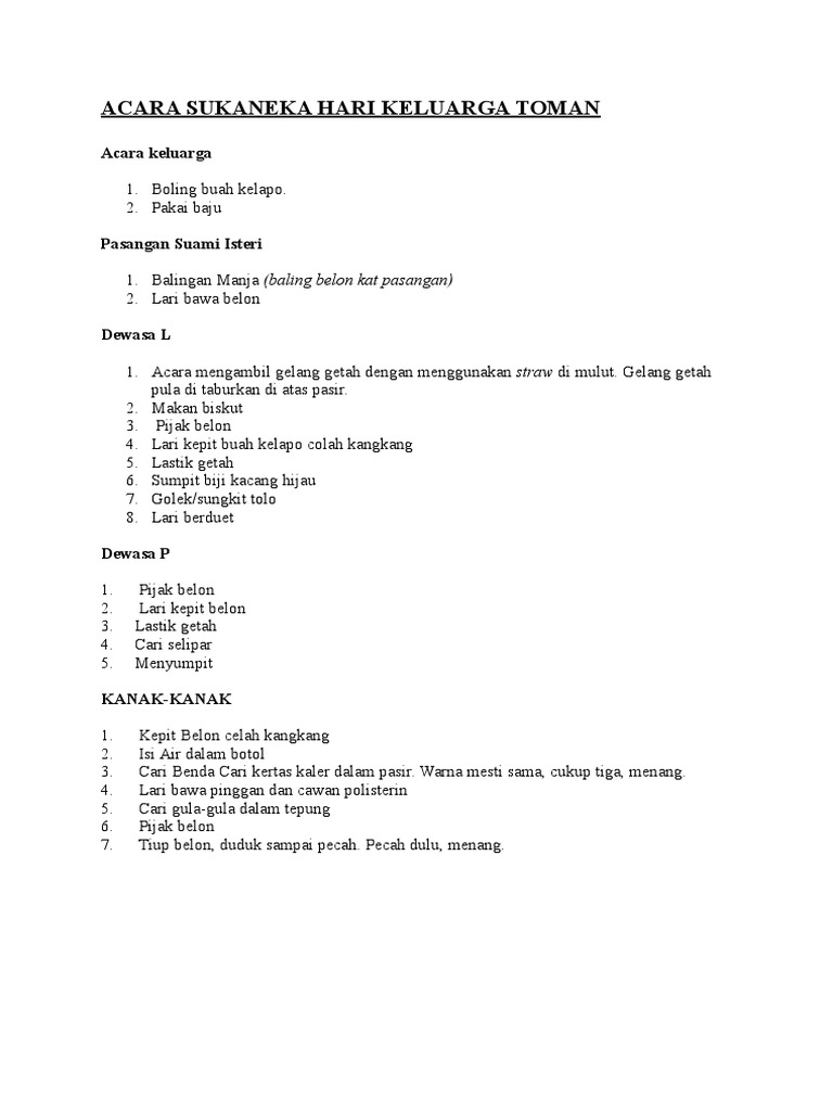 Kertas kerja hari keluarga dan sukaneka anjuran persatuan penduduk dan madrasah al ittihadiyah taman maim bukit rumbia alor gajah melaka 1 0 pengenalan 1 1 hari keluarga merupakan satu hari yang dapat dilaksanakan di antara pemimpin masyarakat dan juga masyarakat setempat. Nak join family day nih. Acara sukaneka kanak kanak yang sering diadakan di sekolah sekolah rendah amat menarik. Fuh sanggup merentas jem ikut jalan kampung lagi.