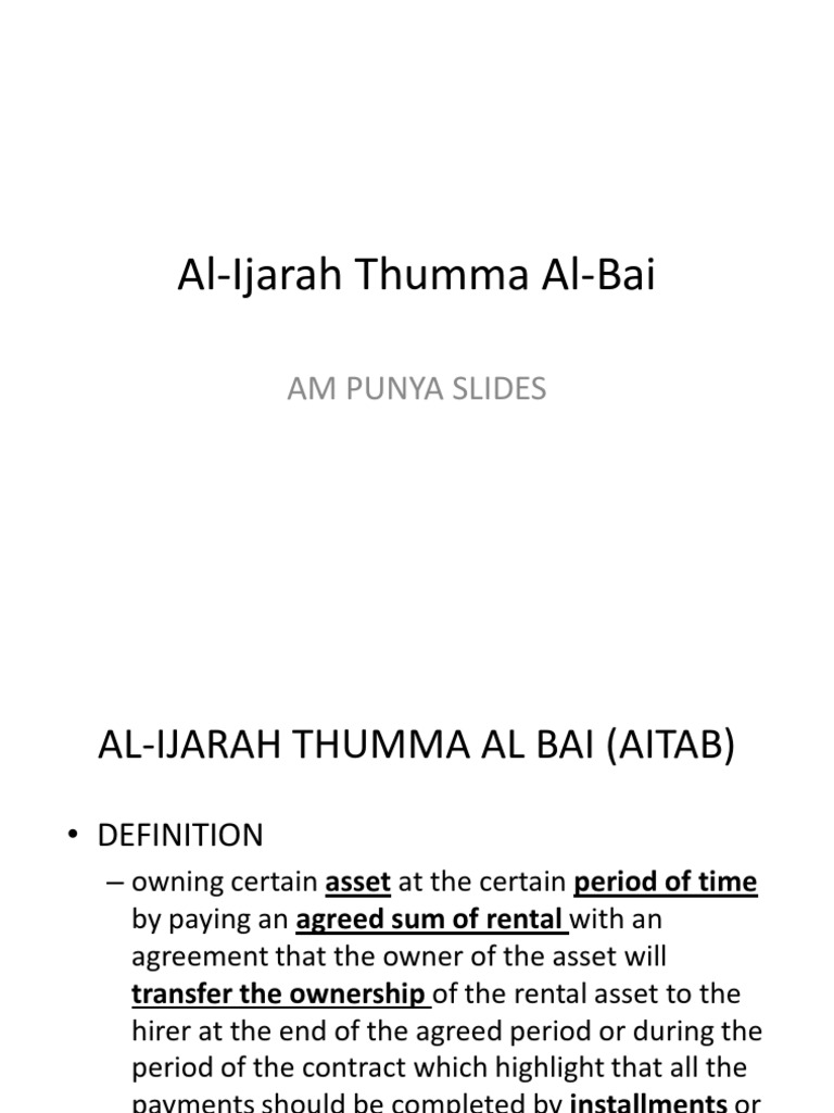 Evidences owning the benefit of certain assets for a specific period of time by paying an agreed sums of rental with an agreement pillars that the owner will transfer the rented asset to the hirer at the end of the agreed period or during the period. Ijarah thumma al bai means hire purchase it refers to how parties will enter into contracts which come into effect in a serial manner in order to form a complete lease or buyback transaction. Up to 9 years. Al ijarah thumma al bay aitab aitab also known as ijarah wa iqtina or al definition ijarah muntahiya bi tamlik definition.