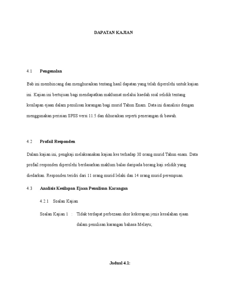 Bab 4 dapatan kajian 4 1 pengenalan hasil kajian daripada temubual yang dijalankan kepada seorang responden penutur natif dialek kedah telah memberikan data yang diinginkan. Antara aspek aspek temubual yang dijalankan ialah berkenaan frasa kerja bahasa bugis dan. 5 0 dapatan kajian pada bahagian ini dapatan kajian yang telah diperolehi akan dirumuskan daripada hasil daripada maklumat maklumat yang telah dikumpul. Dapatan kajian adalah mengikut objektif kajian.