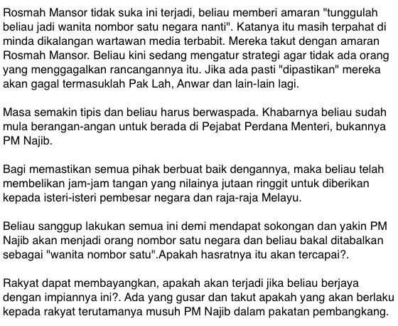 Dalam posting wa yang sini dan sini wa cuma nak jelaskan bahawa yang sepatutnya menjadi isteri pertama pm najib bukan lah rosmah mansor seperti yang di ketahui kini. Selain itu beliau juga merupakan bekas canselor universiti selangor unisel. Maka wujudlah berbagai skandal yang mengaitkan namanya seperti kes altantunya isu pembelian kapal selam dan jet sukhoi isu pakaian seragam pelatih plkn dan banyak lagi.