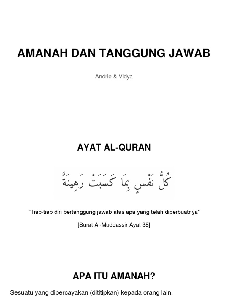 Ayat al quran tentang amanah. Sesungguhnya kami telah mengemukakan amanah kepada langit bumi dan gunung gunung maka semuanya enggan untuk memikul amanah itu dan mereka khawatir akan mengkhianatinya dan dipikullah amanah itu oleh manusia. Sumber buku siswa akhlak kelas x ma kementerian agama republik indonesia 2014. Dalil dalil dari hadits tentang amanah. Sesungguhnya manusia itu amat zhalim dan amat bodoh qs.