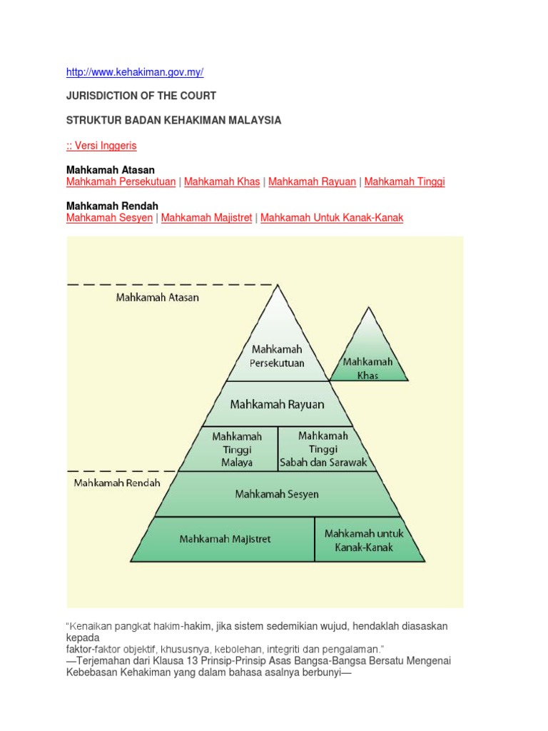 Sistem kehakiman di malaysia adalah sistem mahkamah dipersekutuakan dan beroperasi secara seragam di seluruh negara. Fungsi utama badan kehakiman 1. Jenayah di malaysia membicarakan kes sivil yang melibatkan amaun atau nilai hal dituntut tidak melebihi rm250 000. Kuasa tertinggi di malaysia ialah.