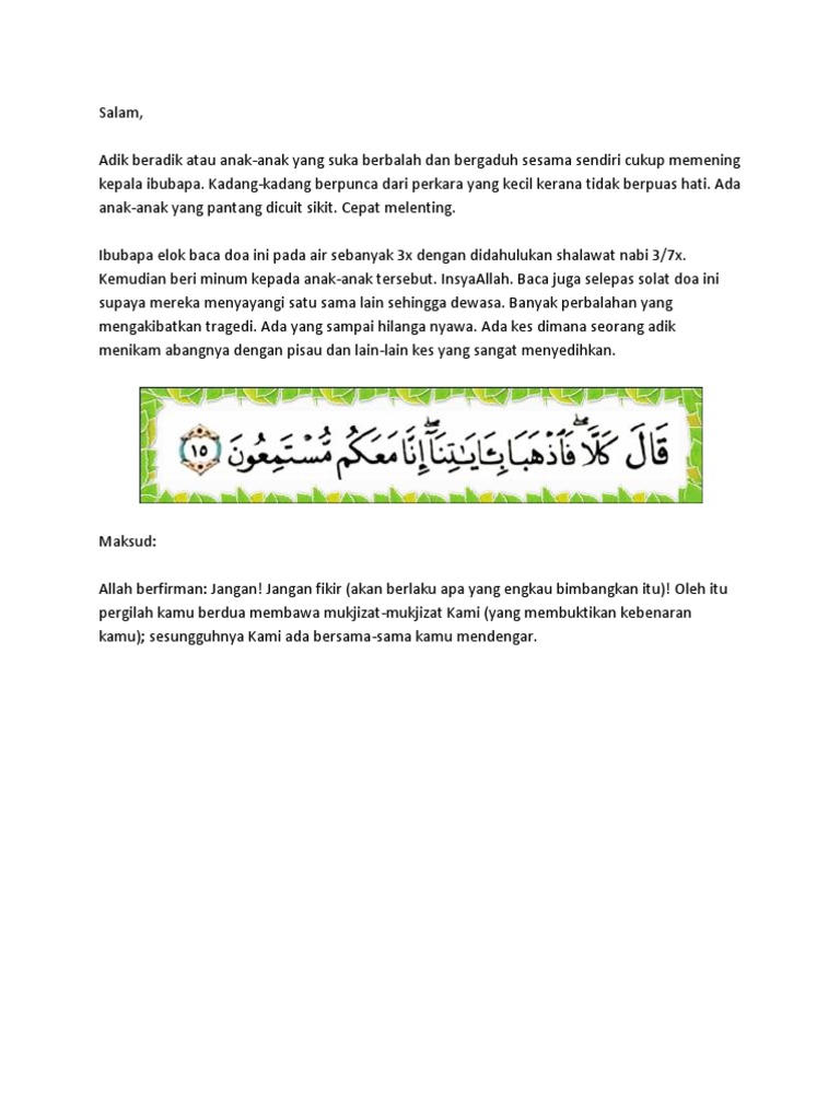 Masa kecil mungkin kita boleh dengar nasihat itu sebab kita masih dalam pengawalan mak ayah. Jangan sesekali berasa tertekan dan mengangap bilangan adik beradik yang ramai sebagai bebanan dan sukar sebaliknya anggaplah kehadiran adik beradik sangat memeriahkan dan tidak sunyi. Doa doa di atas adalah cara dan ikhtiar kita untuk melembutkan hati insan yang dikasihi samaada isteri suami anak anak ibu bapa adik beradik sahabat sahabat dan sesiapa sahaja dengan niat dan hasrat untuk kebaikan. Beri layanan yang sama kepada setiap anak.