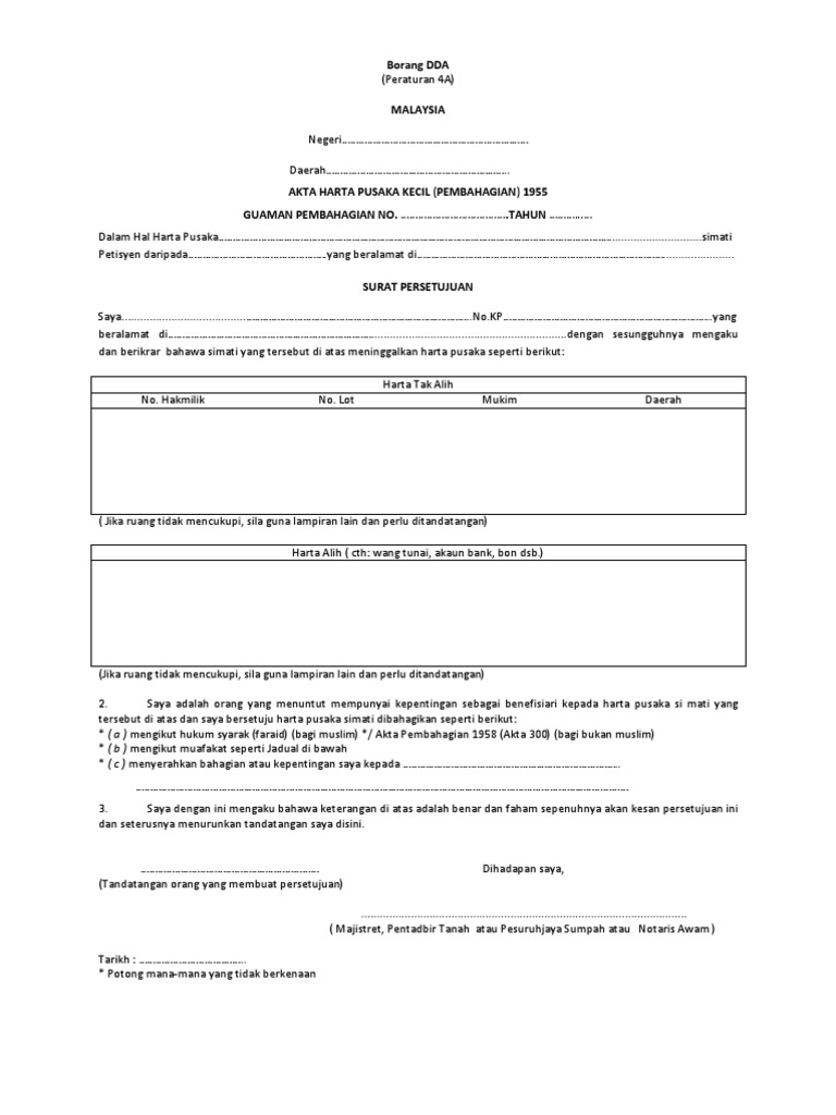 Borang f akta harta pusaka kecil pembahagian 1955. Undang undang pembahagian harta tertakluk undang. Saya ialah orang yang menuntut mempunyai kepentingan dalam harta pusaka tersebut sebagai benefisiari kepada harta pusaka simati yang tersebut di atas dan bersetuju harta pusaka simati dibahagikan seperti yang berikut. Di samping akta terdapat peraturan pembahagian pusaka yang menggariskan tatacara pelaksanaan dan pemakaian borang borang dalam urusan penyelesaian pusaka kecil. Akta pembahagian harta pusaka kecil 1955 ialah satu akta yang digubal untuk memproses dan menyelesaikan harta pusaka kecil si mati.
