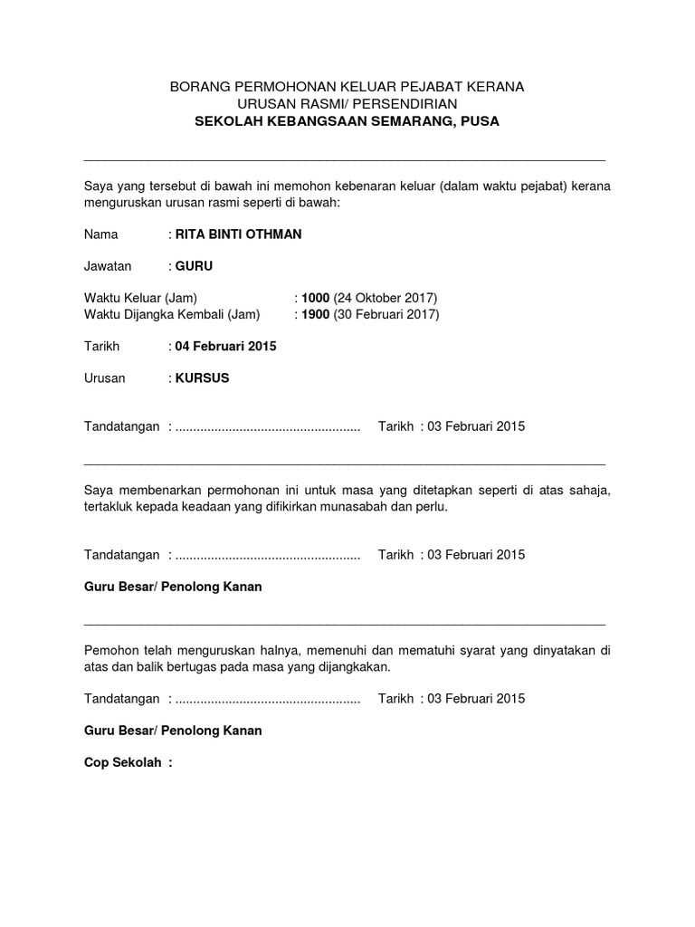 Saya dengan butir butir diri seperti di atas memohon kebenaran menggunakan kenderaan sendiri untuk perjalanan seperti berikut. Urusan persaraan urusan persaraan. Surat tawaran keluar negara borang cuti rehat aplikasi hrmis 4. Borang permohonan untuk bertugas di luar ibu pejabat last modified by.