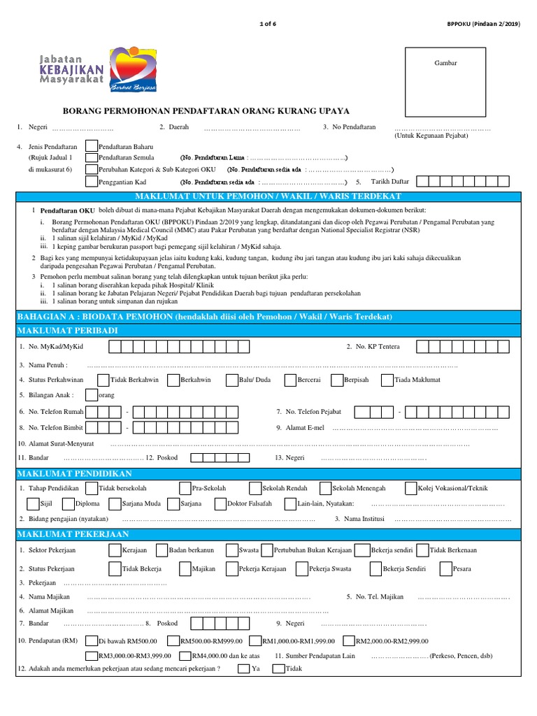 Borang permohonan kad oku 2020. 10 22 2020 4 37 49 pm. Borang permohonan pendaftaran kad oku borang yang telah lengkap dan disahkan beserta sekeping gambar berukuran passport dan salinan dokumen sokongan seperti mykad sijil kelahiran mykid diserahkan kepada pegawai jkm. Salinan kad oku salinan kad pengenalan penjaga jika ada. Berita baik buat anda ibu tunggal dan oku yang berkelayakan membuat permohonan bantuan jabatan kebajikan masyarakat jkm tahun 2020.