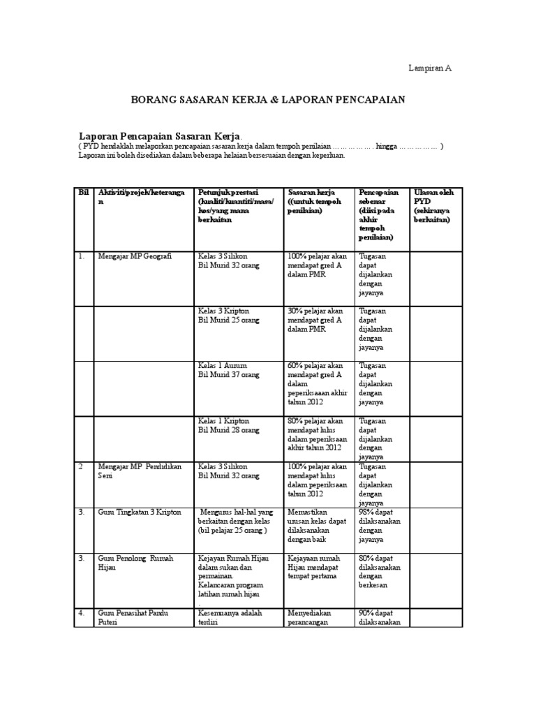 Dulu isi kat borang hijau je. Aktiviti projek keterangan senaraikan aktiviti projek petunjuk prestasi kuantiti kualiti masa kos mana mana yang berkaitan sasaran kerja berdasarkan petunjuk prestasi pencapaian sebenar diisi pada akhir tahun mana yang berkaitan ulasan 1. Dengan kata lainnya semua kakitangan awam terpaksa dan dipaksa untuk mengisi borang sasaran kerja tahunan ni tak kira rela ataupun tidak. Sasaran kerja tahunan contoh pengisian sasaran kerja tahunan dan laporan pencapaian bil.