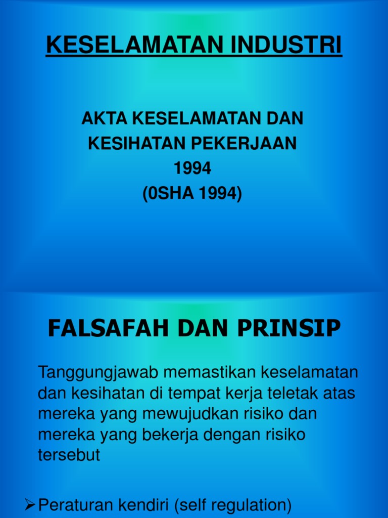 Akta keselamatan dan kesihatan pekerjaan 1994 akta 514 dan 7 peraturan di bawahnya. Yang tinggi bagi keselamatan dan kesihatan pekerjaan bertujuan untuk memastikan semua pihak khususnya majikan dan pekerja lebih bertanggungjawab dalam mewujudkan satu suasana kerja yang selamat mohd yazam 2001. Sila rujuk kepada gambar halaman belakang buku untuk membaca ringkasan buku tersebut. Akta keselamatan dan kesihatan pekerjaan 1994.
