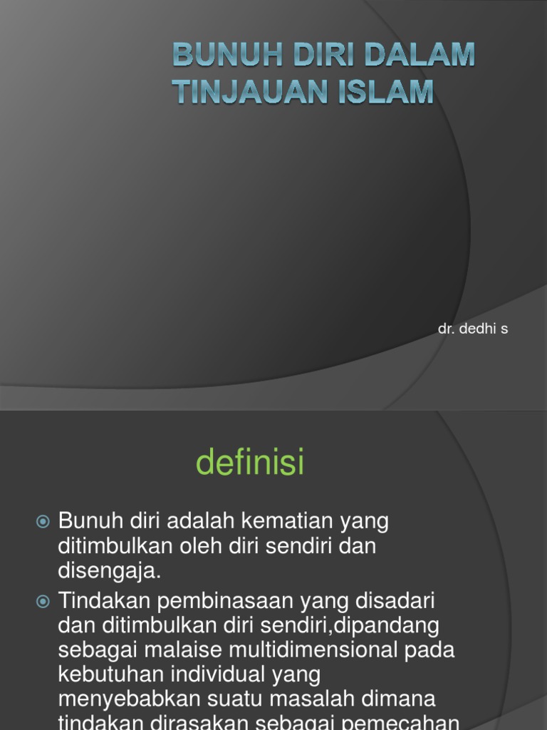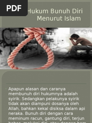 Sebab tindakan bunuh diri jelas tidak dengan serta merta menyelesaikan masalah yang dihadapi. Logikanya cukup sederhana bahwa nyawa adalah milik allah sehingga sebagai manusia tidak memiliki hak apapun atas nyawa kita. Nashih nashrullah diskusi islam kontemporer tentang bunuh diri berjalan di sepanjang garis tradisi dan penafsiran klasik. Barangsiapa bunuh diri dengan minum racun maka kelak ia akan meminumnya sedikit demi sedikit di dalam neraka jahannam kekal di sana selama lamanya.