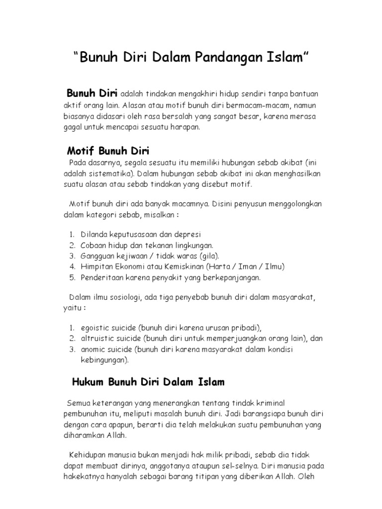 Mendekatlah diri kepada allah agar senantiasa meningkatkan keimanan kita sehingga menghindarkan kita dari perilaku bunuh diri. Egoistic suicide bunuh diri karena urusan pribadi 2. Anomic suicide bunuh diri karena masyarakat dalam kondisi kebingungan. Bahkan salah satu unsur tujuan syariah maqasid asy syar iah yaitu perlindungan terhadap jiwa dan raga hifz an nafs al quran menyatakan dengan jelas.