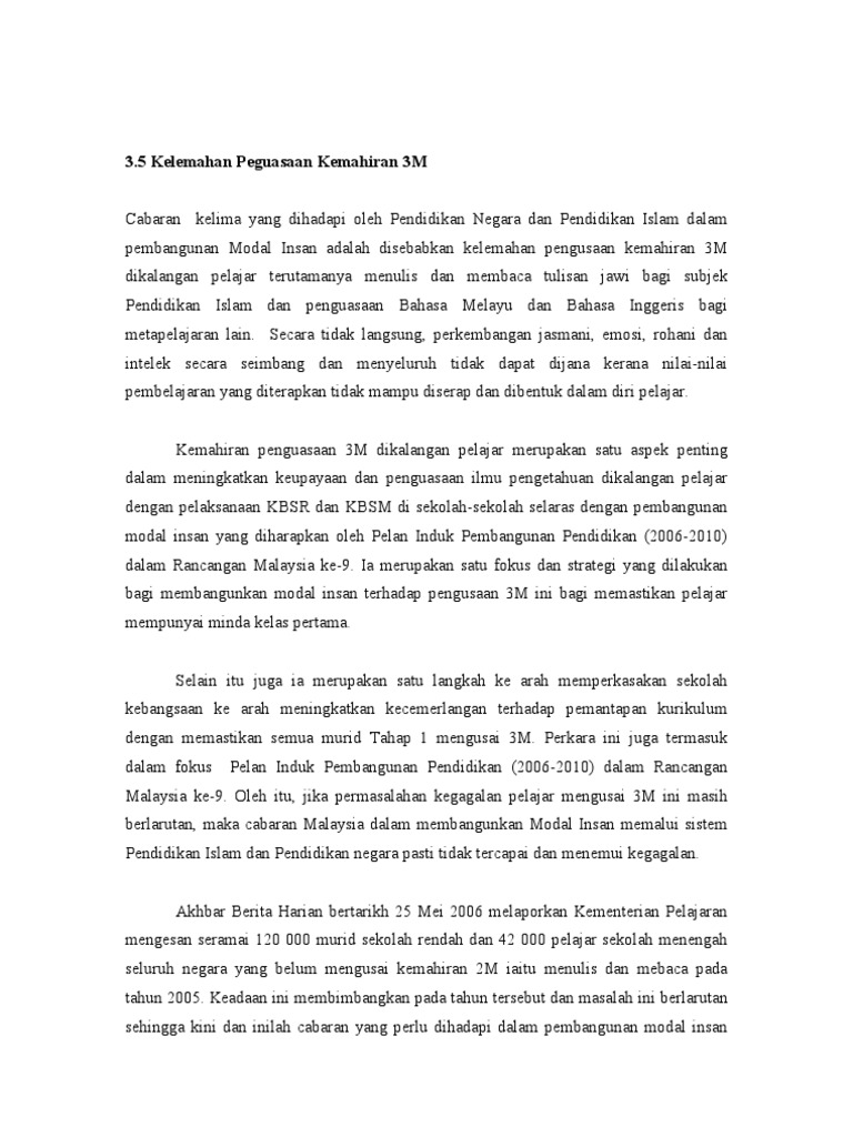 Cabaran dalam pembangunan modal insan sementara itu kajian oleh manoj et al. Cabaran dari aspek pendidikan yang dihadapi oleh pendidikan negara dan pendidikan islam dalam pembangunan modal insan adalah disebabkan kelemahan penguasaan kemahiran 3m dalam kalangan pelajar terutamanya menulis dan membaca tulisan jawi bagi subjek pendidikan islam dan penguasaan bahasa melayu dan bahasa inggeris bagi matapelajaran lain. Mahu ataupun tidak mahu semua. 2016 mendapati modal insan yang mempunyai input tinggi dalam bidang pendidikan pengalaman kerja latihan bab 5 11 1 2019 indd 90 5 29 2019 1 27 46 pm.
