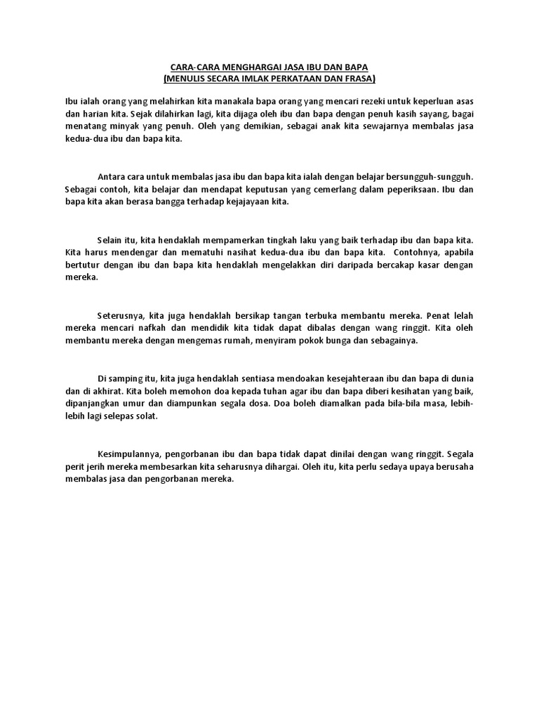 Merekalah orang yang banyak berjasa kepada kita. Sesudah lahir kita dijaga dengan penuh kasih sayang bagai menatang minyak yang penuh. Isi isi bagi karangan jenis ini juga boleh disesuaikan dengan bentuk soalan berikut. Pelbagai cara boleh kita lakukan untuk membalas jasa mereka.