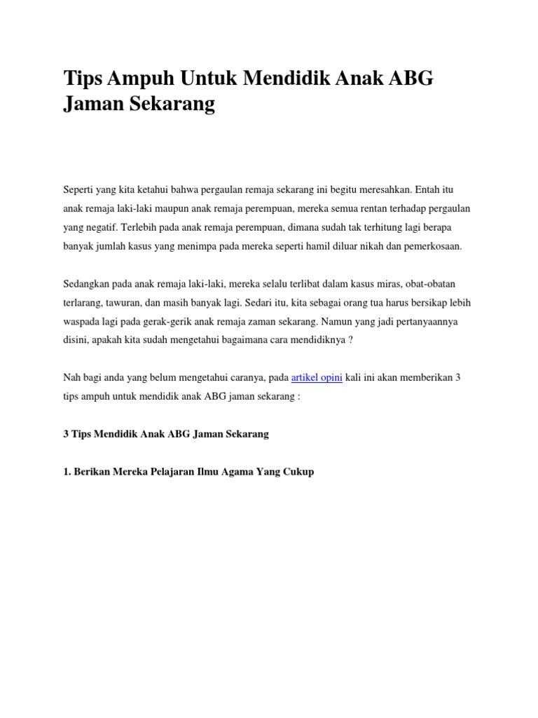 Akibatnya anak bisa terkena narkoba minuman keras rokok seks bebas dan melawan orang tua. Meski demikian mendidik anak remaja untuk menjadikannya pribadi yang hebat bukanlah hal mustahil selama orangtua memperhatikan poin berikut ini. Doronglah anak untuk terus berkembang dan mengeksplorasi diri serta kemampuannya. 2 latih mereka untuk malu bila berhadapan dengan orang asing dan ajnabinya kerana malu adalah benteng pertahanan terkuat seorang.