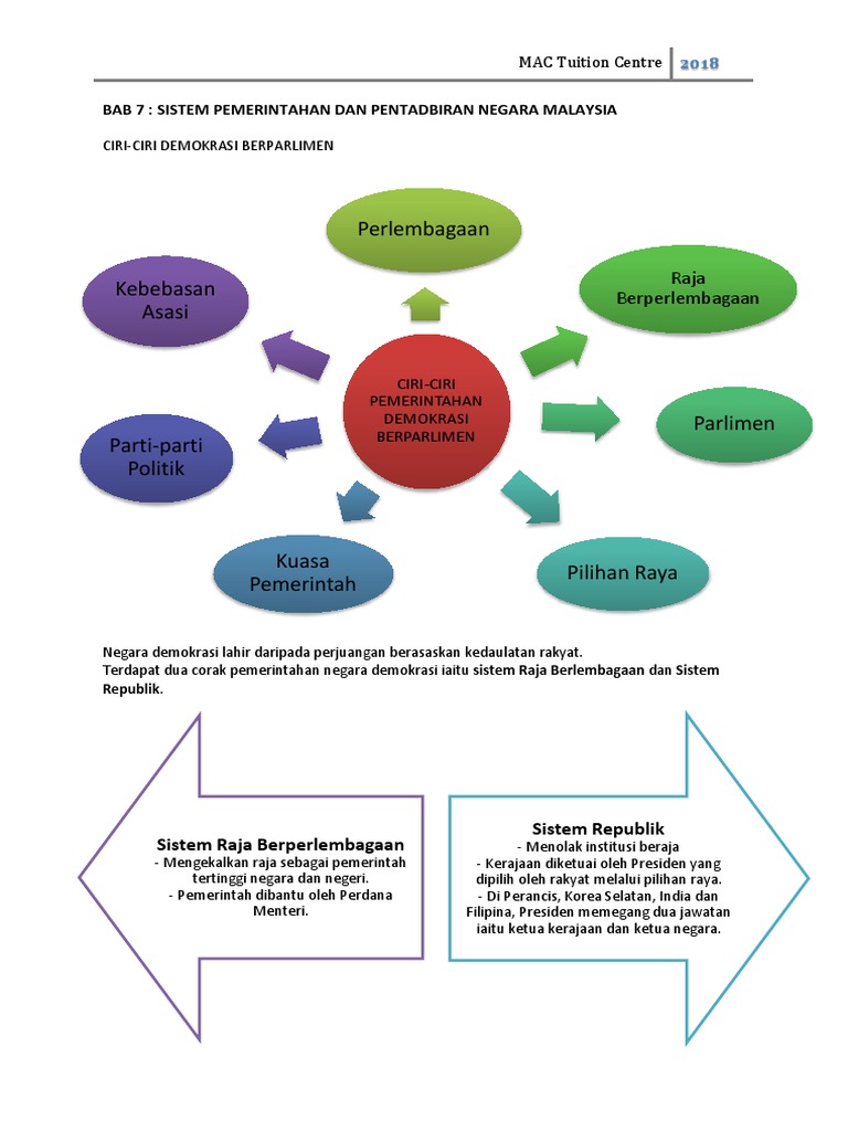 Pemerintahan malaysia memaparkan amalan demokrasi berparlimen dan raja berpelembagaan telah menjadikan pilihan raya sebagai proses memilih wakil rakyat untuk memerintah sama ada pada peringkat negeri atau persekutuan. Nota sejarah tingkatan 5 bab 7 sistem pemerintahan malaysia. Umumnya terdapat dua corak pemerintahan demokrasi iaitu sistem raja berperlembagaan dan republik. Ciri ciri demokrasi berparlimen draft.