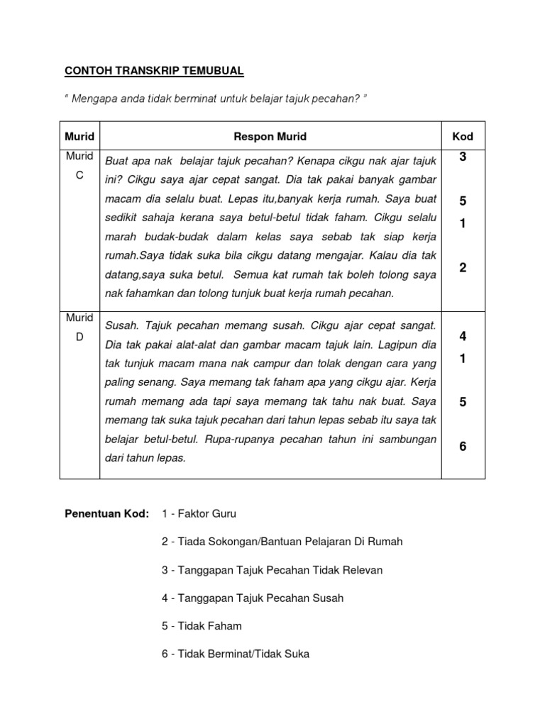 Contoh analisis transkrip temubual. Academia edu is a platform for academics to share research papers. Save save contoh analisis data temu bual for later. Transkrip 1 di malaysia ni dalam konteks saya ambil dalam konteks aah kampung dululah. 2 1 hasil temu bual dengan guru cemerlang melalui wawancara bersama guru cemerlang itu kita dapati beliau adalah seorang yang sentiasa bersedia untuk berkongsi segala pengalaman dan kejayaan yang pernah dicapai dengan pihak yang memerlukannya.