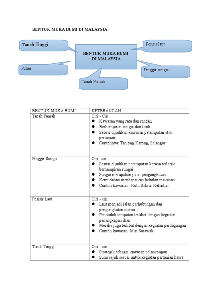 Malaysia terletak di antara garis lintang 1ou 7ou dan garis bujur 100ot 120ot. 2 menerangkan pelbagai bentuk muka bumi pinggir laut negara malaysia berdasarkan rajah. Bentuk muka bumi yang pelbagai itu memungkinkan pelbagai kegiatan ekonomi dijalankan di malaysia. Bentuk muka bumi di peringkat tengah termasuk susuh bukit berpanca dan liku sungai.