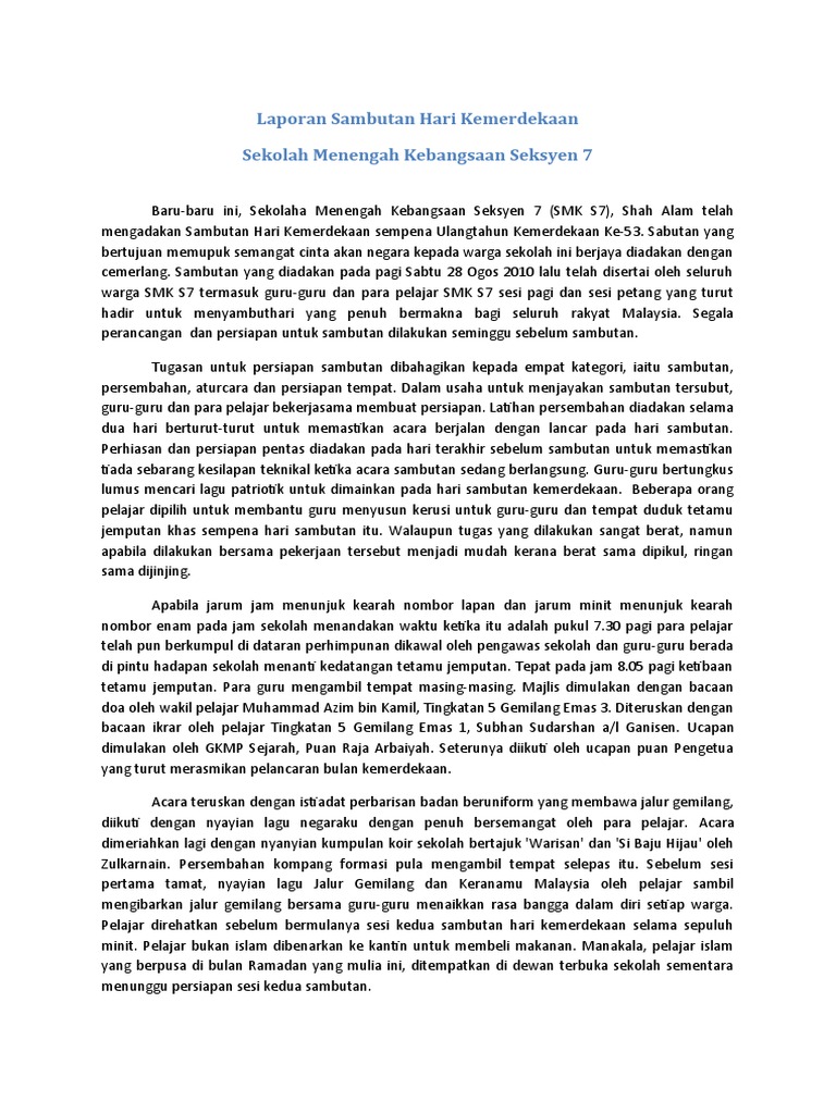 Contoh karangan pendek sambutan hari kebangsaan. Contoh karangan laporan sambutan kemerdekaan peringkat sekolah. Sambutan tersebut diadakan pada tarikh 31 ogos bersempena hari kemerdekaan negera. Kami pun pulang ke rumah dengan gembira. Majlis sambutan hari guru berakhir pada pukul 1 00 petang.