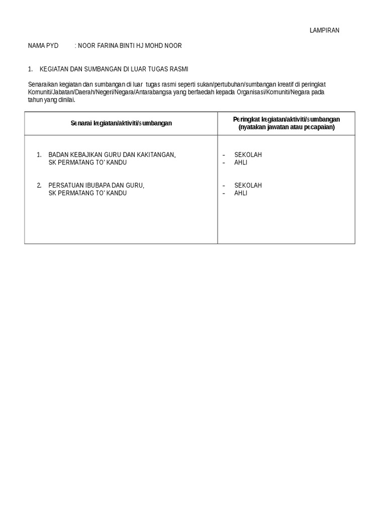 Contoh lampiran lnpt lampiran. Langkah 1 klik di petak untuk. Kegiatan dan sumbangan di luar tugas rasmi. Persatuan ibubapa dan guru sk putrajaya presint 9 2 2.