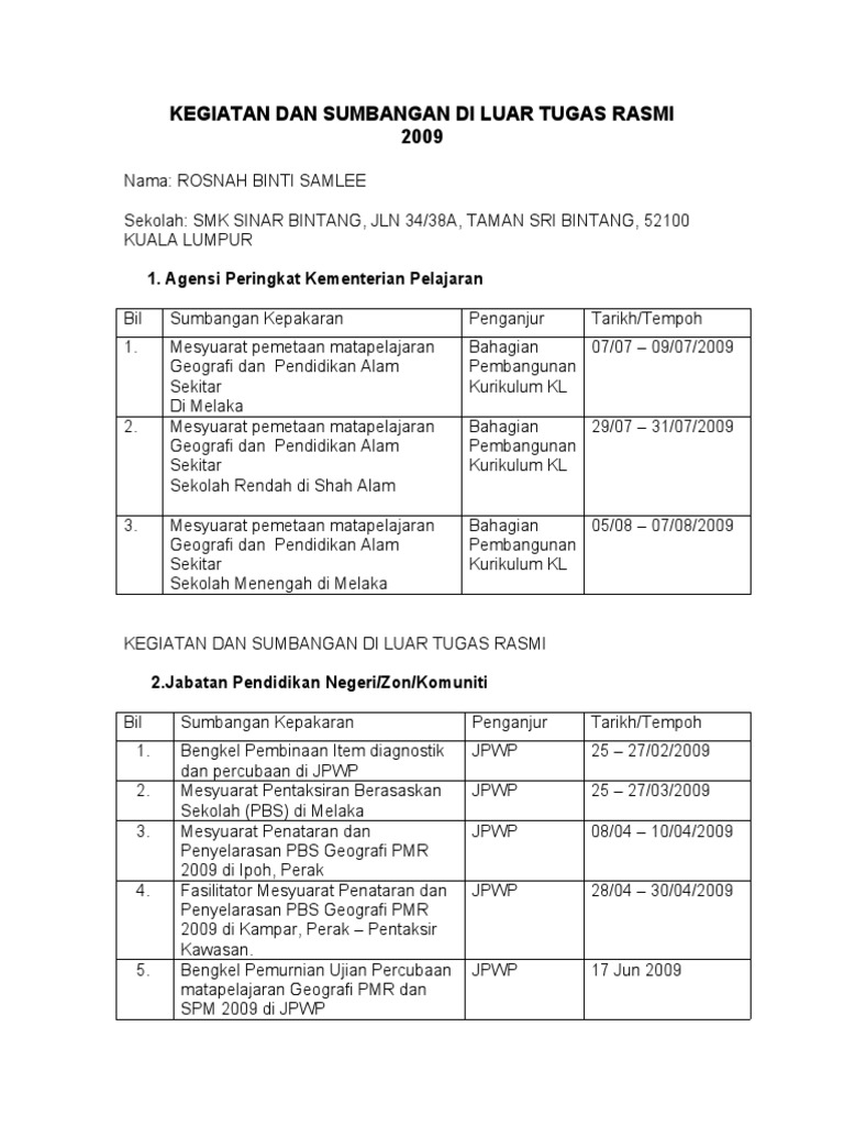 Sekiranya pyd gagal mengisi maklumat kegiatan sumbangan luar tugas rasmi implikasi yang dihadapi adalah seperti. Keselamatan diri pelajar semasa pengajaran pendidikan jasmani dan kesihatan serta kegiatan kokurikulum dan sukan di dalam dan di luar kawasan sekolah. Kegiatan dan sumbangan di luar tugas rasmi senarai kegiatan aktiviti sumbangan peringkat kegiatan aktiviti sumbangan nyatakan jawatan atau pencapaian 1. Mengumpul atau menyunting segala rekod laporan aktiviti dan kegiatan sekolah untuk dimuatkan dalam majalah sekolah.