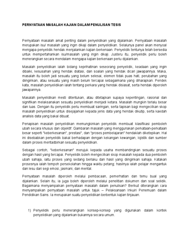 Pernyataan masalah kajian dalam penulisan tesis. Penyelidik tentunya telah bersedia untuk mempertahankan isu masalah yang ingin dikaji. Selalunya pensyarah akan menyoal mengapa hendak menjalankan kajian berkenaan. Dalam kajian ini penulis mempelbagaikan contoh contoh daripada kata kerja dan kata nama.