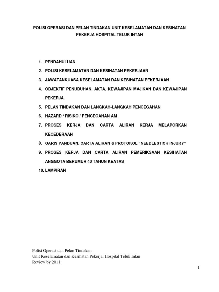 Lampiran 1 contoh polisi keselamatan dan kesihatan 15 lampiran 2 contoh carta organizasi kkp 16 lampiran 3 contoh pelan tahuan kkp 25 lampiran 4 contoh senarai pemeriksaan mesin 33 lampiran 5 contoh minit mesyuarat 36 lampiran 6 contoh dokumentasi dan latihan kpp 38 rujukan dari ms1722 yang digunkan dalam garispanduan ini english. Dasar keselamatan dan kesihatan pekerjaan dasar keselamatan dan kesihatan pekerjaan ini disediakan berasaskan kepada keperluan akta keselamatan dan kesihatan pekerjaan 1994 akta 514 seksyen 16 yang mana menekankan beberapa perkara penting berkaitan dengan dasar keselamatan dan kesihatan pekerjaan yang wajib dilaksanakan oleh majikan. Posted by shazzy at 9 39 pm. A mengkaji keberkesanan latihan keselamatan dan kesihatan pekerjaan dalam industri.