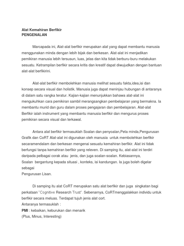 Contoh soalan pemikiran kritis dan kreatif. Pemikiran kritis juga merupakan pembelajaran aktif berkenaan pengamatan dan maklumat yang digunakan sebagai panduan untuk menilai dan bertindak pemikiran refleksi yang memberikan fahaman baru pentafsiran pengetahuan berasaskan pemerhatian dan penilaian satu usaha untuk memahami pengetahuan berasaskan bukti dan penaakulan serta satu cara penilaian yang menuntut pemikir mengawal pemikirannya. Berpikir kritis dalam bahasa inggris disebut critical thinking yang memiliki definisi berpikir kritis menurut para ahli yaitu proses intelektual yang dengan aktif dan terampil mengkonseptualisasi menerapkan menganalisis mensintesis dan mengevaluasi. Namun demikian kemahiran kemahiran tersebut perlu dipelajari dan dilatih supaya individu menjadi seorang yang mahir dan berkeupayaan menggunakannya dalam semua keadaan. Contoh berpikir kritis demokratis pada saat bermusyawarah kegiatan tersebut juga terdapat banyak tindakan yang membutuhkan pemikiran kritis berpikir kritis.