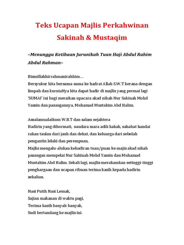 Teks pengacara majlis. Mohon izin menggunakan format teks sebagai asas teks majlis persandingan anak saudara. Ucapan terima kasih terima kasih atas semua doa restu yang terpanjatkan kepada kami. Sekali lagi patik bersama isteri dan keluarga melafazkan ungkapan junjungan kasih di atas kesudian tuan yang terutama sudi berangkat ke majlis ini.