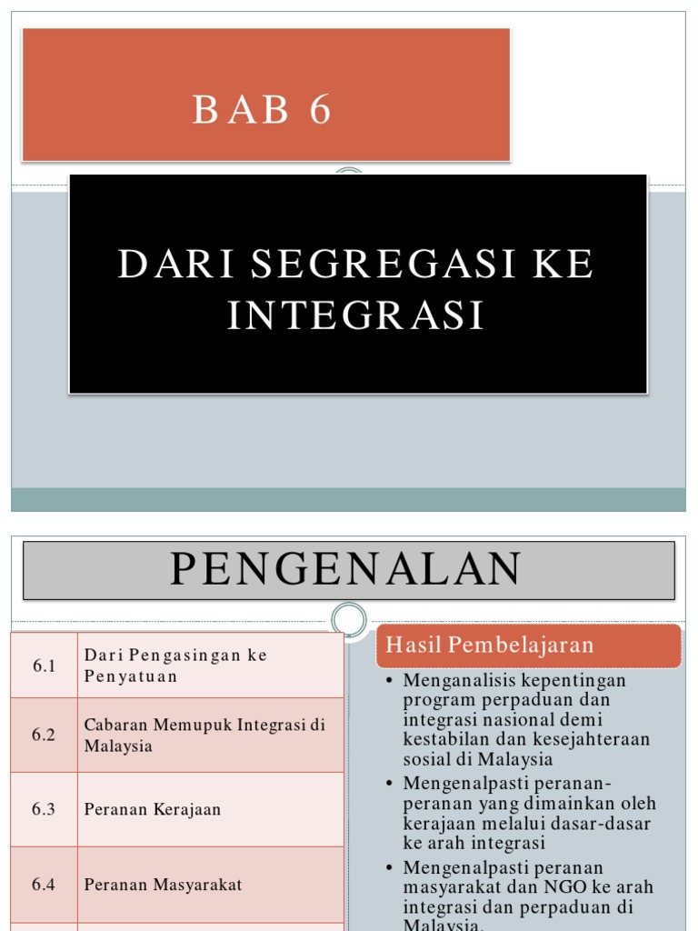 Dari segregasi ke integrasi. Bab 7 dari segregasi ke integrasi 1. Menilai peranan kerajaan dalam mengeratkan hubungan etnik di malaysia. Bidang ideal bagi membentuk perpaduan integrasi khususnya. Dari pengasingan ke penyatuan.