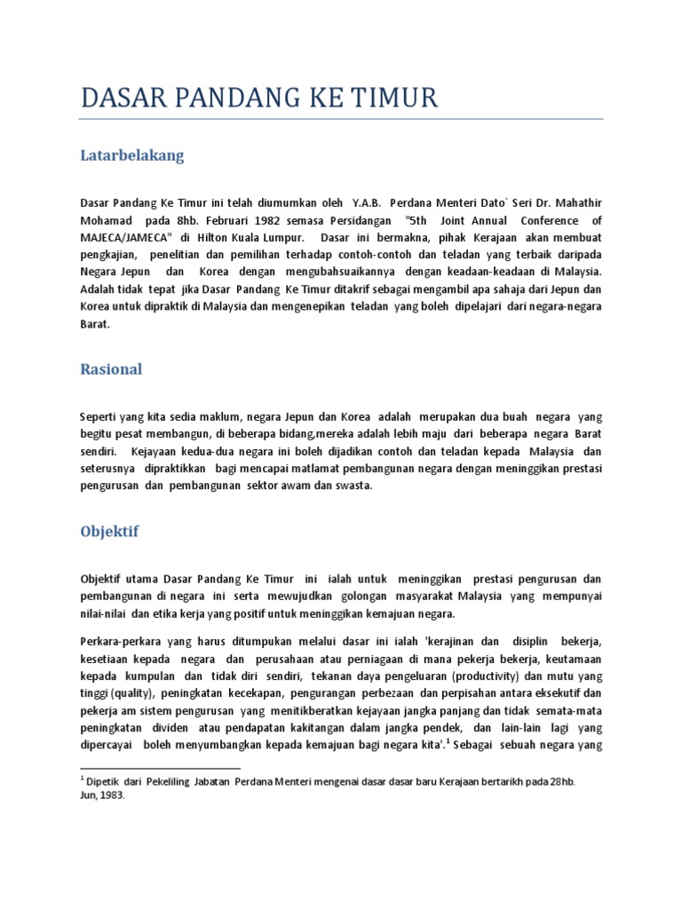Kajian ini akan menganalisis kewujudan dasar pandang ke timur di semenanjung tanah melayu semasa era kolonial british. Walaupun terdapat pelbagai kritikan dan cabaran dalam dasar pandang ke timur ini melalui sektor awam terdapat kemajuan sedikit sebanyak melalui dasar pandang ke timur ini. Dasar pandang ketimur mem. Pdf on mar 4 2019 mohd afendi daud published dasar pandang ke timur for jurnal geografia find read and cite all the research you need on researchgate.