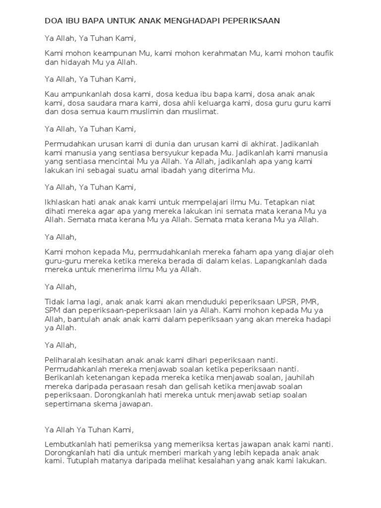 Semoga anak kita esok akan tenang dan diberi kefahaman dalam menjawap peperiksaan tersebut ye kekawan. Teringat pula masa sekolah dulu dulu. Berpesan agar siapa yang ingin panjang umur dan ditambahi rezekinya hendaklah berbakti kepada ibu bapanya dan menyambung tali kekeluargaan mendoakan ibu bapa juga menjadi sebab mengalirnya rezeki. Bacaan doa doa untuk anak menghadapi peperiksaan dan mudah belajar.