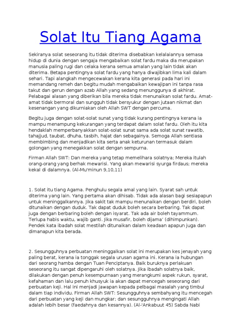 Solat tiang agama jabatan agama islam selangor 4 hadis qudsi diriwayatkan oleh at tirmizi. Itu tidak tepat bahkan lafadz ini sholat adalah tiang agama telah diriwayatkan oleh imam abu nu aim gurunya imam bukhori dalam kitabush sholat dari habiib bin saliim dari bilaal bin yahya ia berkata seorang laki laki mendatangi nabi lalu bertanya kepada beliau kemudian dijawab oleh nabi. Sholat adalah tiang agama ini dalilnya. Solat adalah tiang agama.