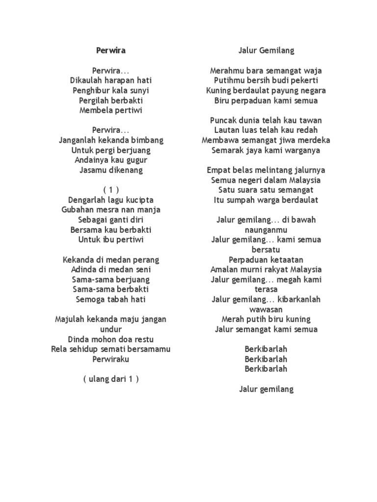 Kami semua bersatu perpaduan ketaatan amalan murni rakyat malaysia jalur gemilang. Lagu patriotik bertajuk jalur gemilang adalah sebuah lagu yang dicipta khas untuk memperingati dan membanggakan bendera malaysia. Dengarlah lagu kucipta gubahan mesra nan manja sebagai ganti diri bersama kau berbakti untuk ibu pertiwi kekanda di medan perang adinda di medan seni sama sama berjuang sama sama berbakti semoga tabah hati majulah kekanda maju jangan undur dinda mohon doa restu rela sehidup semati bersamamu perwiraku ulang dari 1. Jalur gemilang di bawah naunganmu jalur gemilang kami semua bersatu.