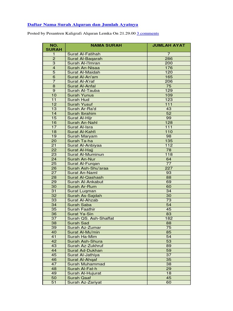 Jumlah surah dalam al quran sebanyak. Jumlah surat dalam al quran sebanyak 114 surat. Surat terpendek adalah al kautsar yaitu 3 ayat. Hening seketika tiba tiba pak ustad bertanya pada saya berapa jumlah ayat dalam al quran sontak pikiran saya yang semula terlihat kosong seketika fokus dan dengan yakinnya menjawab ada 6666 ayat pak. Selain al kautsar ada juga dua surat lainnya yang berjumlah 3 ayat yaitu al ashr dan al nashr.