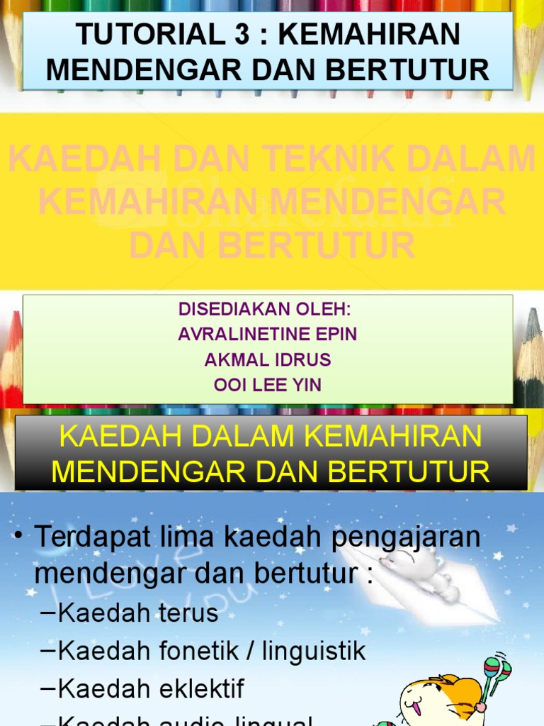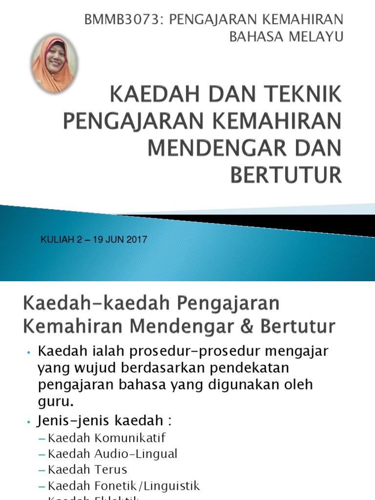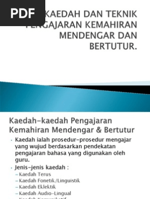 Kaedah dan teknik pengajaran kemahiran mendengar dan bertutur. L menggunakan dialog untuk dihafaz dan diikuti secara ajukan. Kaedah kaedah pengajaran kemahiran mendengar bertutur kaedah terus kaedah fonetik linguistik kaedah eklektik kaedah audio lingual kaedah komunikatif teknik pengajaran kemahiran mendengar dan bertutur teknik soal jawab teknik main peranan teknik lakonan drama teknik permainan bahasa teknik hafazan teknik latih tubi teknik perbincangan teknik penyelesaian masalah slide 17 slide 18. Kemahiran mendengar secara kreatif ini pula merupakan kemahiran yang paling tinggi dan ia menjadi matlamat pengajaran dan pembelajaran lisan di peringkat mendengar. L kaedah mendengar dan kemudiannya bertutur.