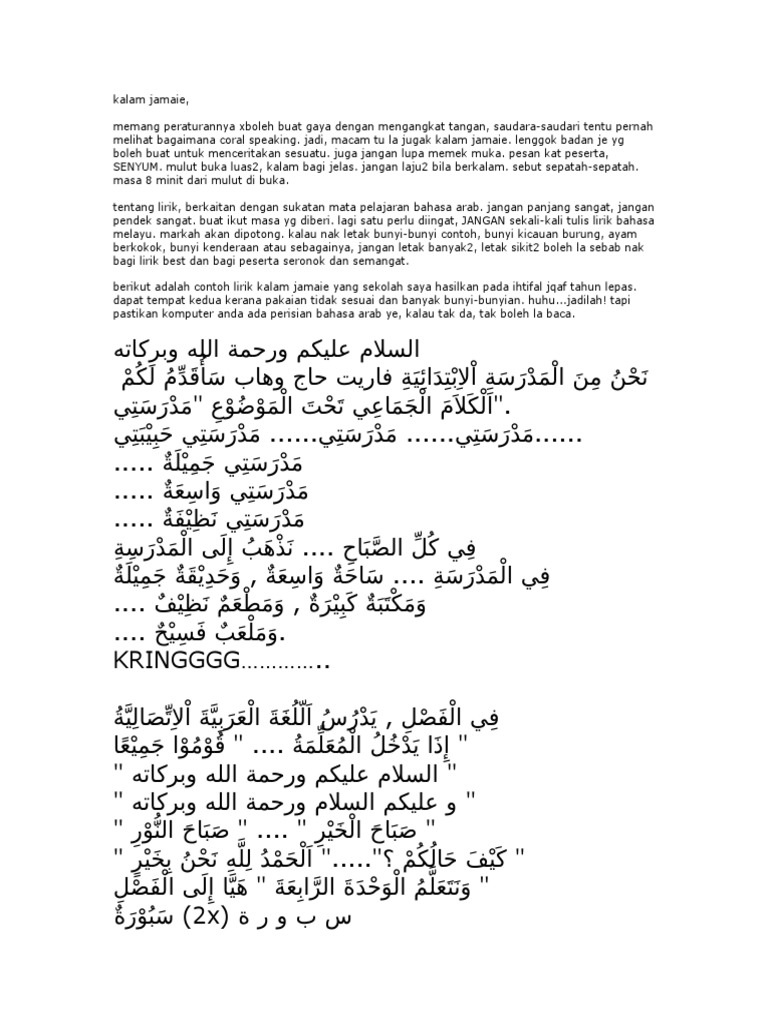 Kalam jamaie bahasa arab. Salah satu darinya adalah skrip kalam jamaie naib johan peringkat negeri perak yang lepas semoga contoh skrip ini dapat memberikan panduan bagi menghasilkan atau mencipta skrip yang baru. Anda dipersilakan untuk memuat turun teks kalam jamaie bahasa arab 1. Tentang kami mrsm gemencheh km 37 jalan tampin gemas kampung sungai dua 73200 gemencheh negeri sembilan darul khusus tel. Kalam jamaie bicara berirama bahasa arab mhi 5 november 2019 duration.