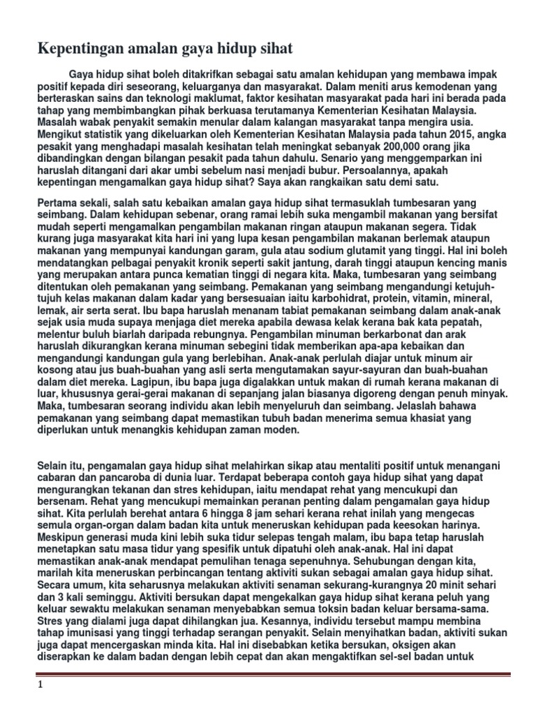 Dalam meniti arus kemodenan yang berteraskan sains dan teknologi maklumat faktor kesihatan masyarakat pada hari ini berada pada tahap yang membimbangkan pihak berkuasa terutamanya kementerian kesihatan malaysia. Panjangnya huraian hendaklah antara 200 hingga 250 patah perkataan. Huraikan pendapat anda tentang amalan gaya hidup sihat yang sewajarnya dipraktikkan oleh setiap individu. Contoh karangan fakta pt3 terbaik bahasa melayu.