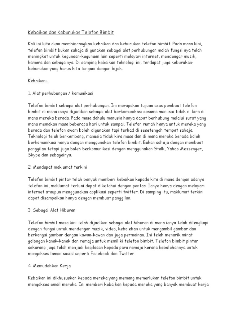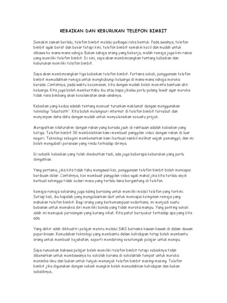 Kebaikan dan keburukan telefon bimbit karangan spm. Bukan sahaja orang yang bekerja malah remaja juga kini ramai yang memiliki telefon bimbit. Pendedahan berkaitan internet ini adalah penting supaya anak anak mengetahui kebaikan dan keburukan internet sewaktu akhlak mereka masih boleh. Kesimpulannya penggunaan telefon bimbit dalam kalangan pelajar mendatangkan lebih banyak kesan buruk daripada kesan baik. Tidak hairanlah telefon bimbit menjadi medium penting untuk masyarakat berinteraksi dalam dan luar negara.