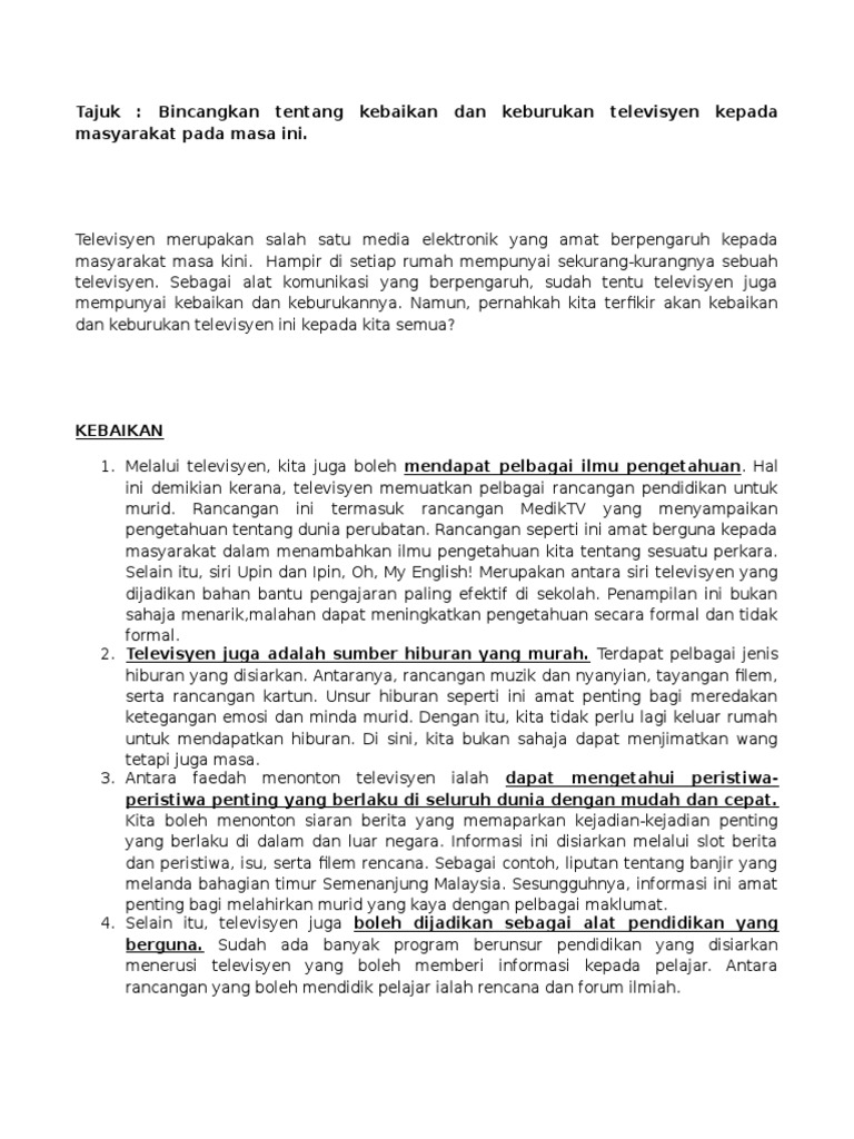 Namun pernahkah kita terfikir akan kebaikan dan keburukan tv ini kepada kita semua. Alat perhubungan ini amat popular pada masa kini. Kebaikan dan keburukan menonton televisyen televisyen merupakan alat ciptaan manusia hasil daripada perkembangan sains dan teknologi. Search inside document.