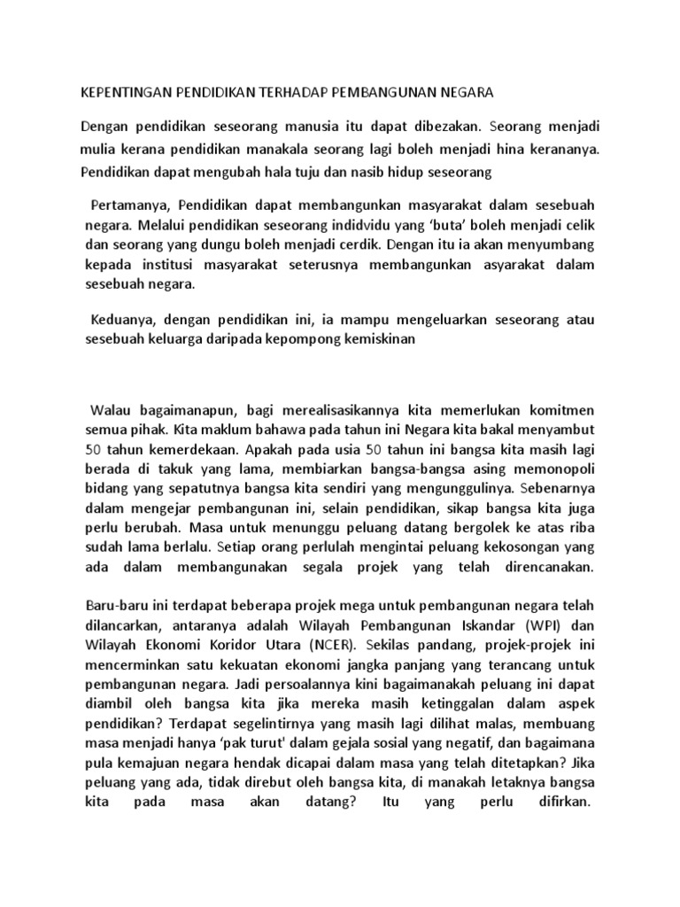 Kepentingan lambang lambang negara. Pendidikan yang berkualiti memberi kuasa kepada individu memberi mereka suara mendedahkan potensi mereka serta meluaskan pandangan dan pemikiran pendidikan merupakan institusi yang paling penting dalam pembentukan keperibadian sesuatu ummah dan pembangunan negara saodah 2014. F6 membezakan malaysia dengan negara lain. Pendidikan bukanformal amat penting kepada sesebuah negara yang sedang pesat membangun seperti malaysia oleh yang demikian pendidikan seumpama ini secara langsung atau tidak langsung mampumembangunkan literasi masyarakat dalam pelbagai disiplin ilmu seperti teknologi maklumat pengurusan kemanusiaan dan kemasyarakatan keusahawanan kenegaraan dan sebagainya pengayaan dan penguasaan ilmu.