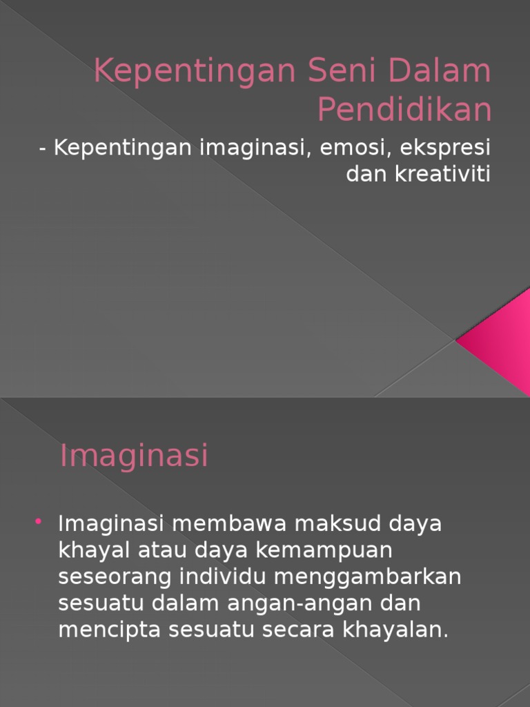 Beberapa kenyataan ini akan menguatkan hujah bahawa pentingnya pendidikan seni visual dalam merealisasikan perubahan tingkahlaku manusia dalam dunia pendidikan. 1 3 konsep latar belakang dan kepentingan seni dalam pendidikan 1 3 1 konsep dan latar belakang merangkumi 3 bidang iaitu seni visual muzik dan pergerakan dalam pembelajaran dan perkembangan kanak kanak. 3 0 kepentingan seni dalam pendidikan kepada pendidik seni dalam pendidikan adalah untuk membantu perkembangan menyeluruh danseimbang setiap insan dari segi intelek rohani emosi dan jasmani selari denganfalsafah pendidikan negara. Ulasan kritis tentang konsep dan teori pembelajaran serta kepentingan seni dalam pendidikan seni dalam pendidikan didefinisikan sebagai aktiviti pengajaran dan pembelajaran seni dalam pendidikan yang melibatkan tiga elemen seni iaitu seni visual seni muzik dan seni pergerakan yang diintegrasikan ke dalam pendidikan faridah nazir et al 2015.