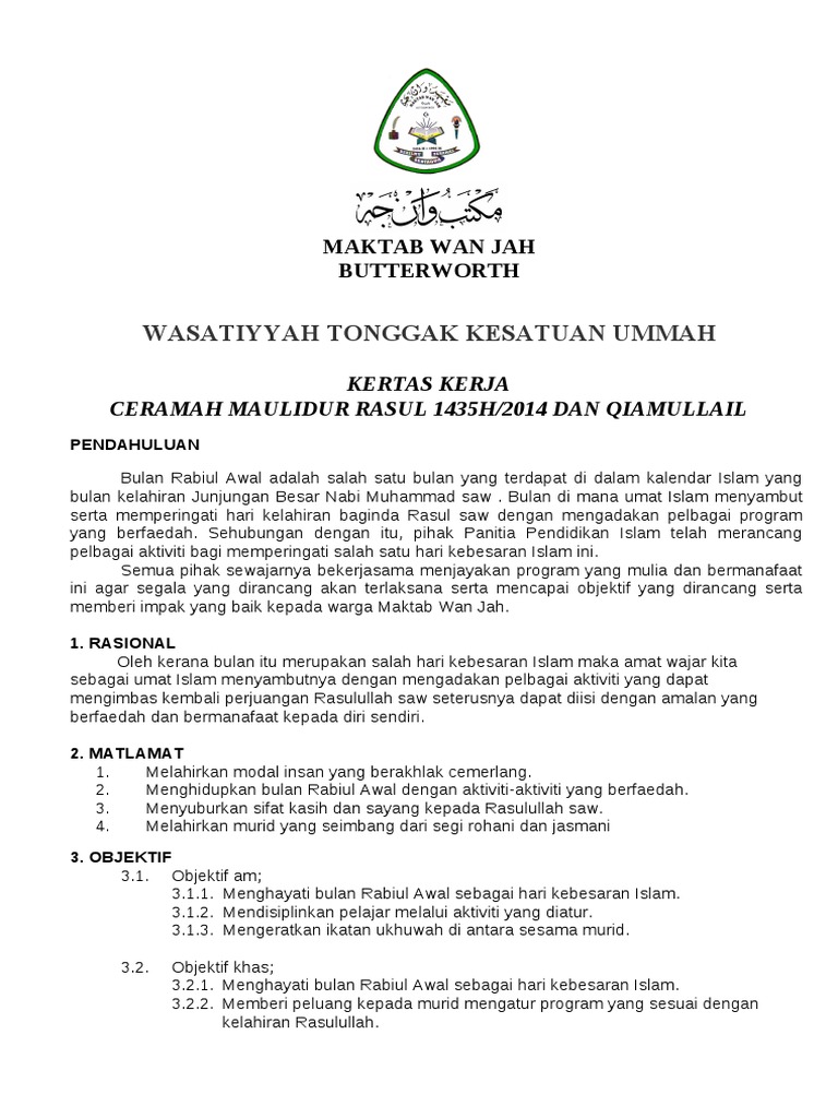 Kertas kerja majlis khatam al quran perdana sk petagas klik di sini kertas kerja 2017 1. Kertas kerja sambutan maulidur rasul 2016 klik di sini 7. Pendahuluan bersempena dengan bulan kelahiran junjungan besar nabi muhammad saw panitia pendidikan islam sekolah kebangsaan tasek gelugor berusaha untuk mengadakan aktiviti serta program bagi mengenang dan memuliakan junjungan besar ini sambutan maulidur. Share kertas kerja maulidurrasul contoh.