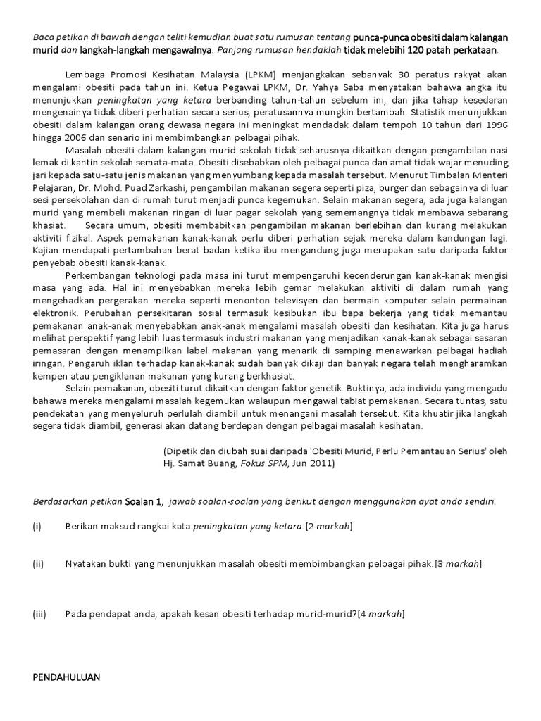 Kadar peningkatan obesiti dalam kalangan pelajar sebenarnya sangat membimbangkan dan sekiranya dibiarkan begitu sahaja ianya akan menjadi permasalahan yang sangat besar buat kita. Daripada data kajian di seluruh dunia pula menunjukkan masalah obesiti di kalangan kanak kanak berada dalam lingkungan 2 6 peratus hingga 3 6 peratus di finland 15 peratus di united kingdom 10 8 peratus di amerika syarikat 11 2 peratus hingga 12 5 peratus dalam kalangan pelajar sekolah di navajo indian 7 56 peratus di india 16 1 peratus di singapura 14 3 peratus di thailand dan 7 8. Cadangan itu memang bagus tapi ramai yang tidak sedar sebenarnya punca anak anak sekarang obesiti bermula dari rumah. Masalah ini seharusnya diberi perhatian kerana golongan remaja merupakan nusa yang bakal menjadi pemimpin masa hadapan negara.