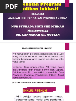 D buku kod amalan pendidikan murid berkeperluan khas 2014 e buku panduan pengoperasian ppki 2015 muat turun f maklumat berkenaan pendaftaran orang kurang upaya oku dan kategori oku jabatan pembangunan orang kurang upaya jabatan kebajikan masyarakat muat turun. A 230 tempoh pendidikan bagi murid berkeperluan pendidikan khas 10 1 pendidikan bagi murid berkeperluan pendidikan khas boleh dilanjutkankepada suatu tempoh seperti yang berikut. Pendidikan khas adalah pengajaran yang direka bagi memenuhi keperluan pendidikan murid dengan keperluan khas. Garis panduan program pendidikan inklusif murid berkeperluan khas garis panduan program pendidikan inklusif murid berkeperluan khas merupakan artikel.