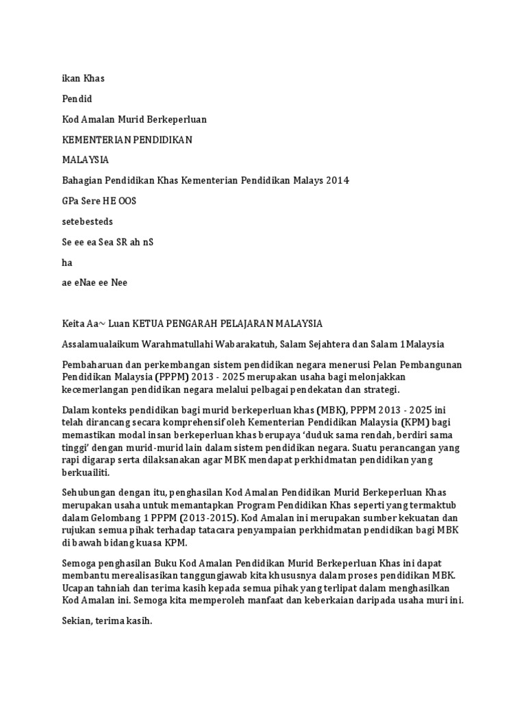 Kod amalan pendidikan murid berkeperluan khas 2014. Kod amalan pendidikan murid berkeperluan khas 1 ketua pendaftar hendaklah menyediakan kod amalan yang mengandungi prosedur standard yang memberi panduan dalam merancang menyediakan dan melaksanakan program pendidikan bagi murid berkeperluan pendidikan khas. Koleksi bahan bahan pendidikan untuk warga guru ibu bapa dan murid pautan download percuma dan bestari. Kod amalan pendidikan murid berkeperluan khas 2014 rujuk pada bab 6 kokurikulum 15. Amalan program pendidikan inklusif pelajar berkeperluan khas di sebuah sekolah.