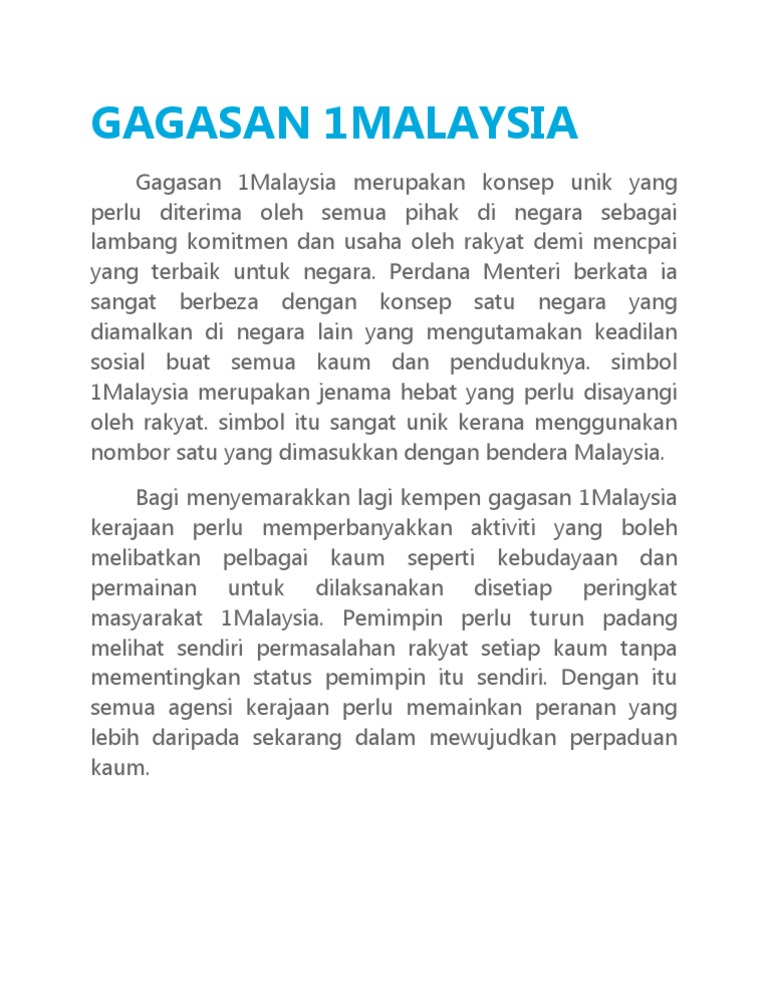Konsep gagasan 1 malaysia. Konsep 1 malaysia bukanlah satu wawasan atau gagasan pemikiran baru. 1 malaysia adalah penerusan agenda membina negara. Konsep 1 malaysia bukanlah satu wawasan atau gagasan pemikiran baru. Mahathir melalui konsep bangsa malaysia dan gagasan wawasan 2020 yang selepas itu dilestarikan pula oleh tun abdullah melalui misi nasional.